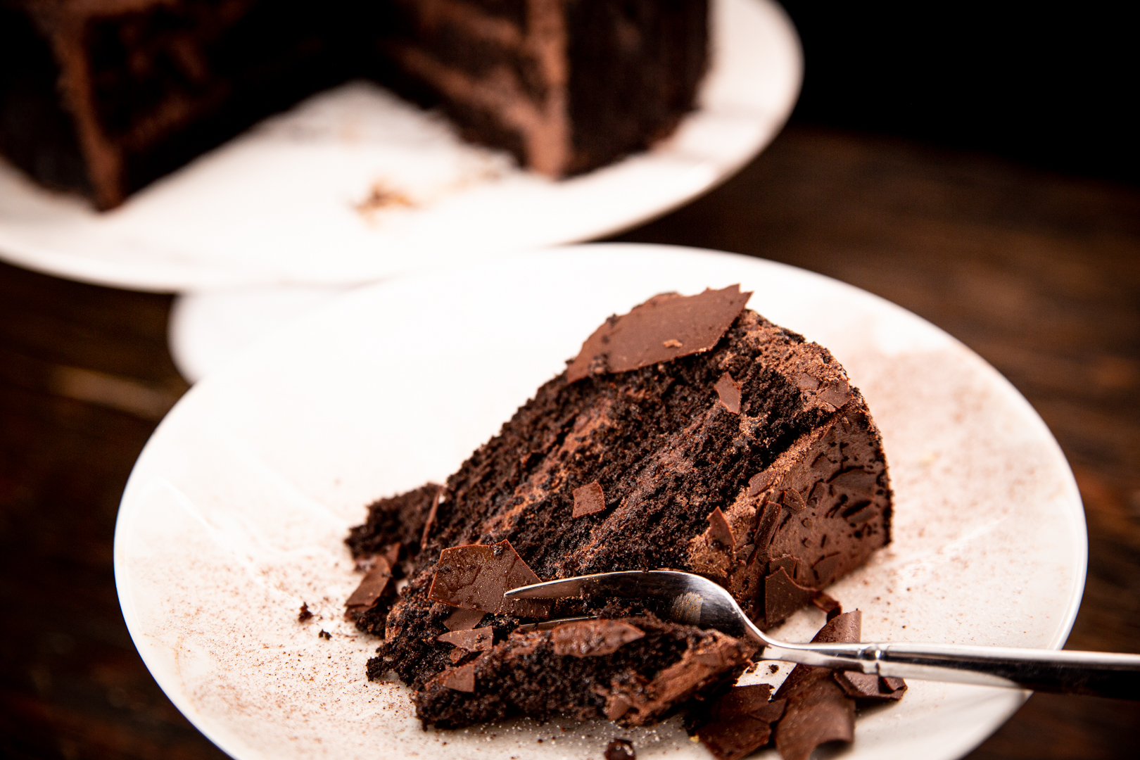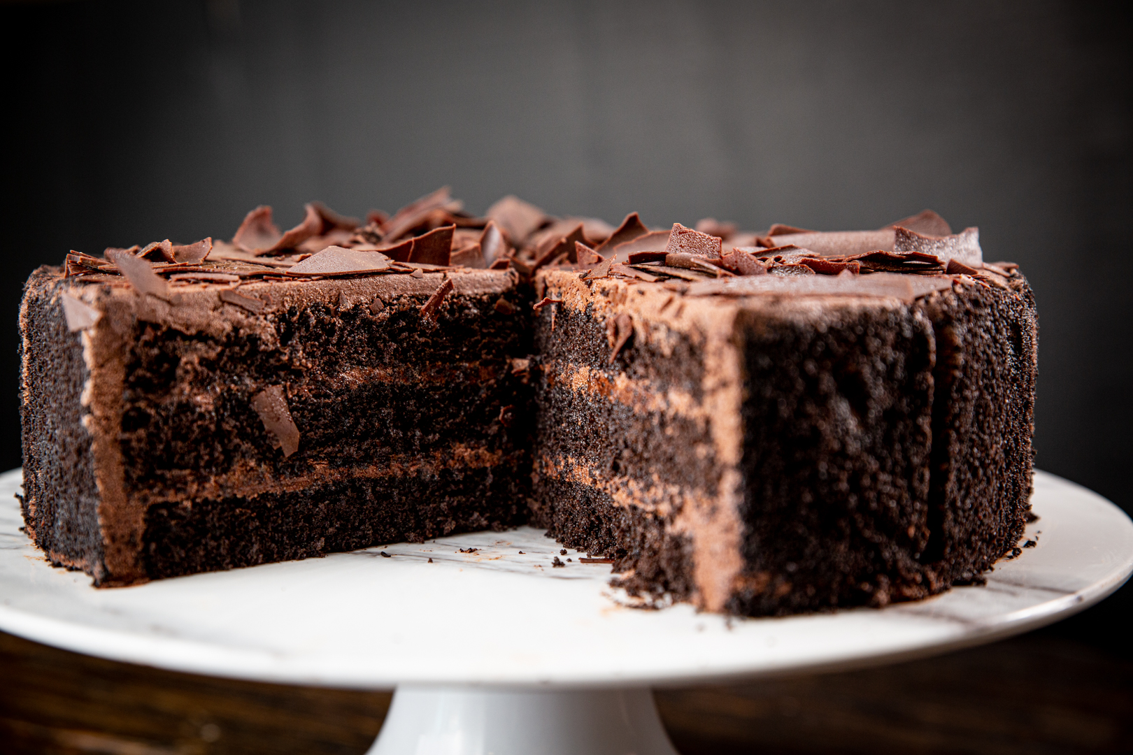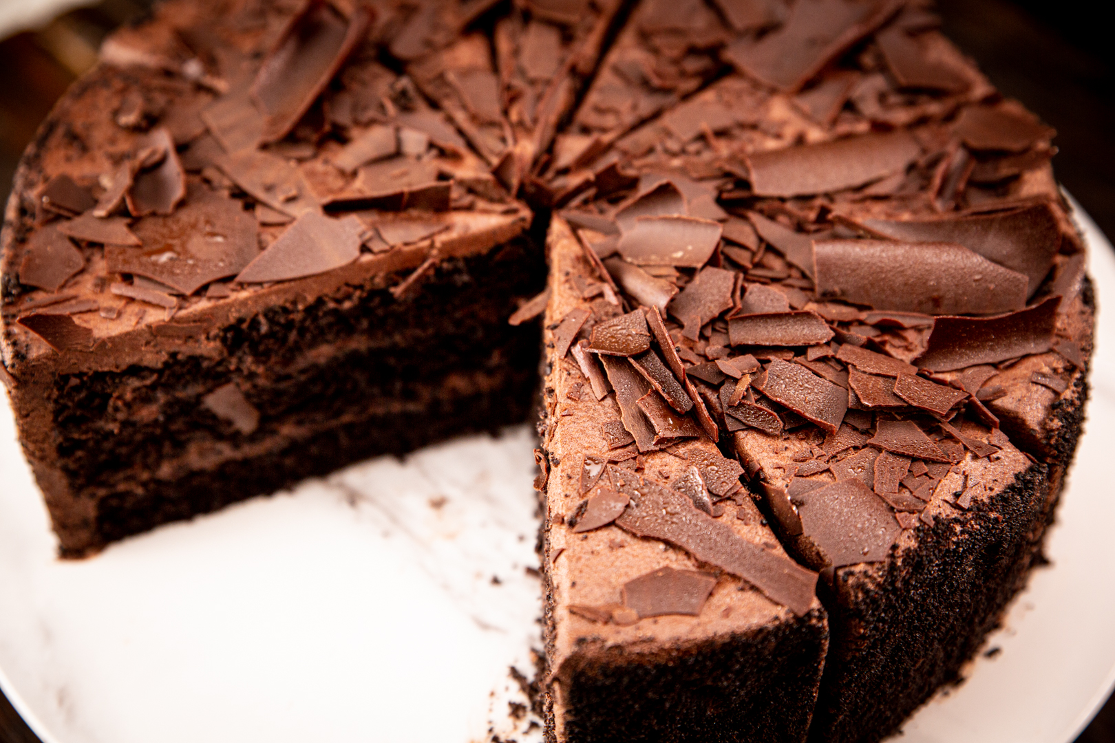 Smooth chocolate buttercream between layers of rich fudge cake covered with chocolate shavings for the ultimate chocolate lovers’ delight