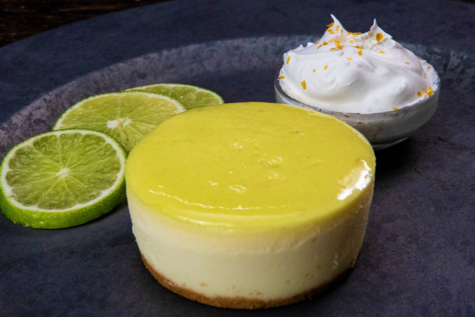 A graham cracker base topping with New York Cheesecake with a big splash of key lime, decorated with a key lime glaze