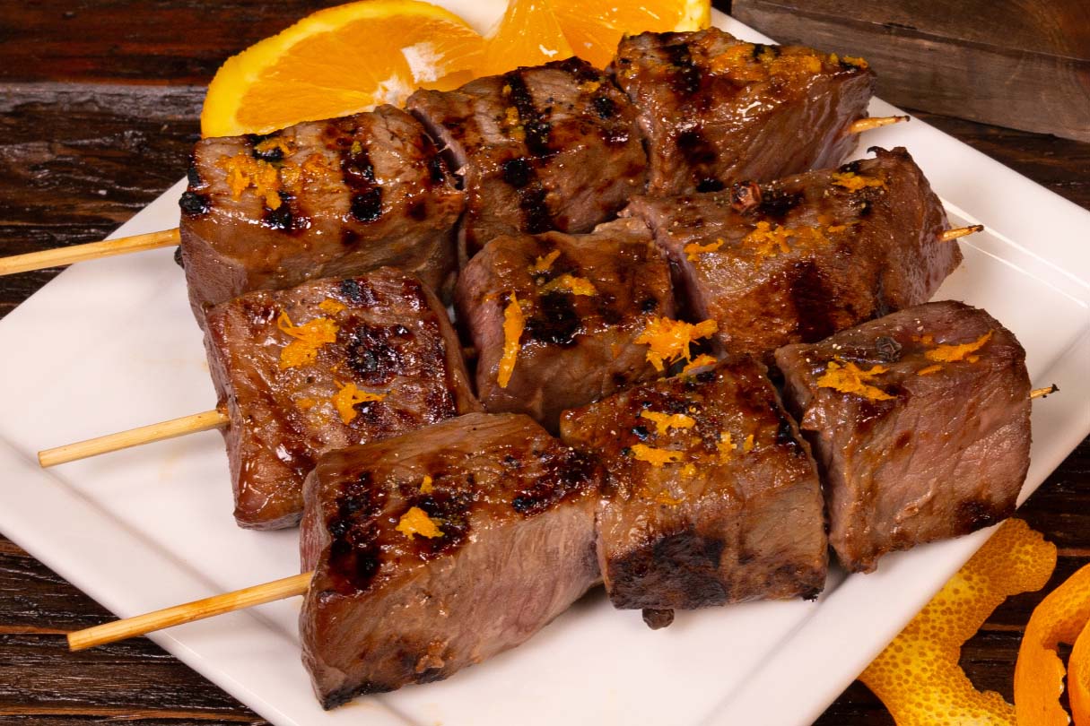 Tender USDA Choice sirloin infused with the flavors of rich hoisin sauce and fresh Valencia orange zest on a 6” skewer.