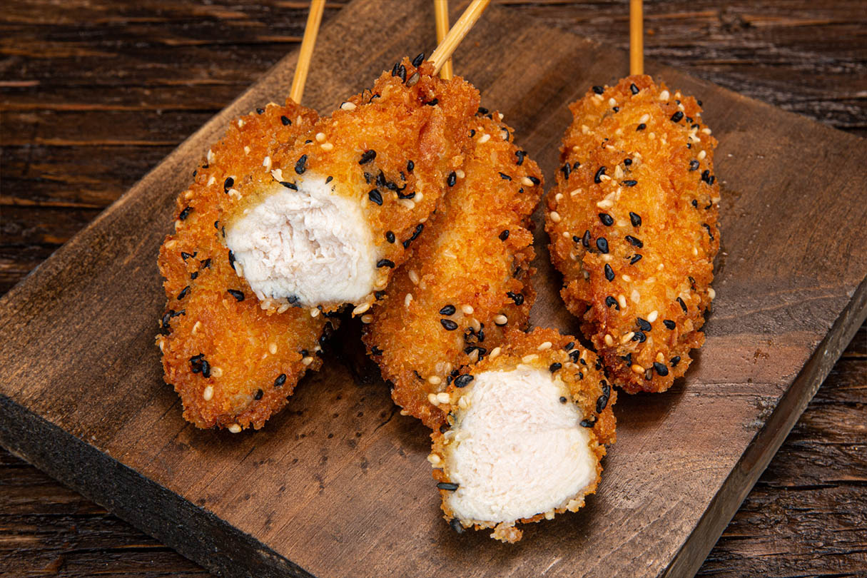 Tender all white meat chicken in a sesame oil infused batter and coated in crispy panko breadcrumbs and black & white sesame seeds on a 6” skewer.