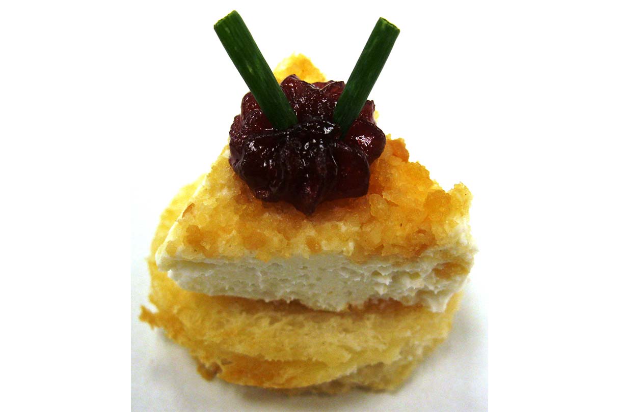 Macadamia nut encrusted wedge of goat cheese garnished with raspberry coulis atop a lightly toasted fresh-baked sourdough crouton.